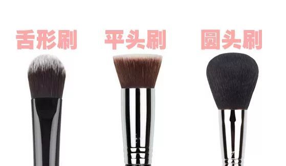 粉底刷通常分為舌形刷、平頭刷、圓頭刷三種。剛剛講過,化妝品有分幹性和濕性,而因為粉底大部分是很有水分和油脂的,屬於濕式化妝品,所以使用人造毛的粉底刷會較耐用。